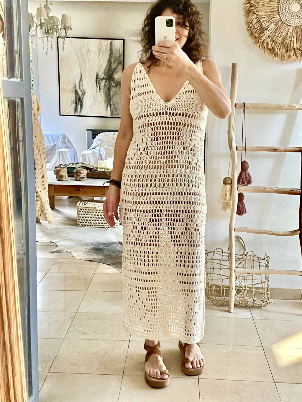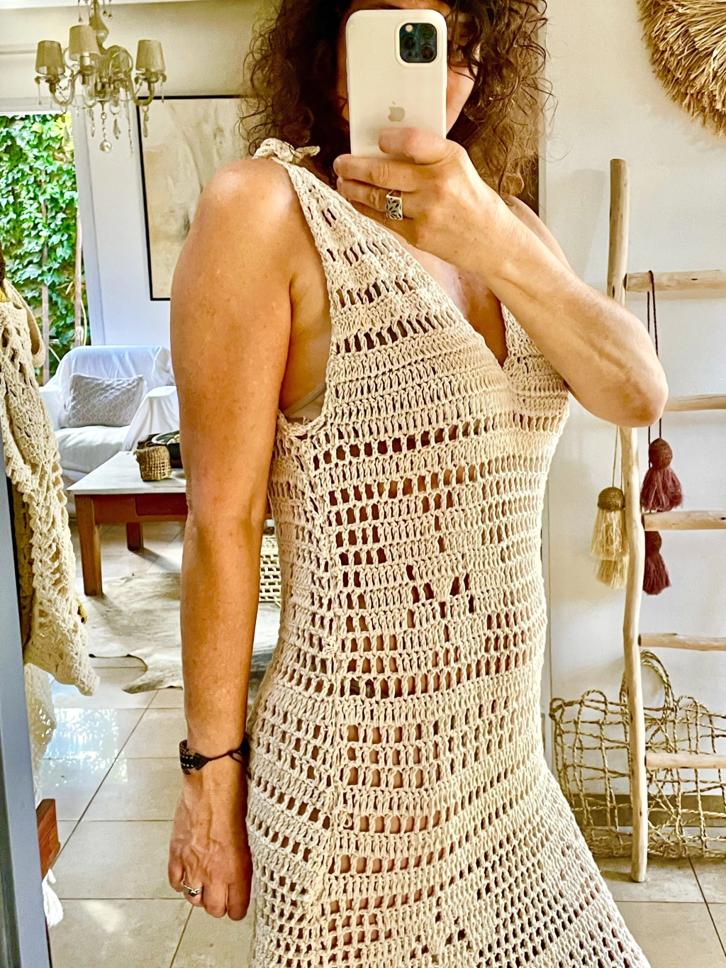Tejido a mano, a crochet, en hilo de algodón color natural, 100 % algodón.