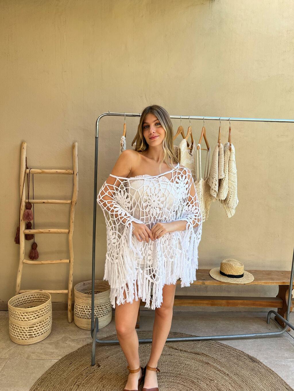 Tejido a mano, a crochet, con detalles tejidas de flores , en hilo de algodón 100% de color blanco.