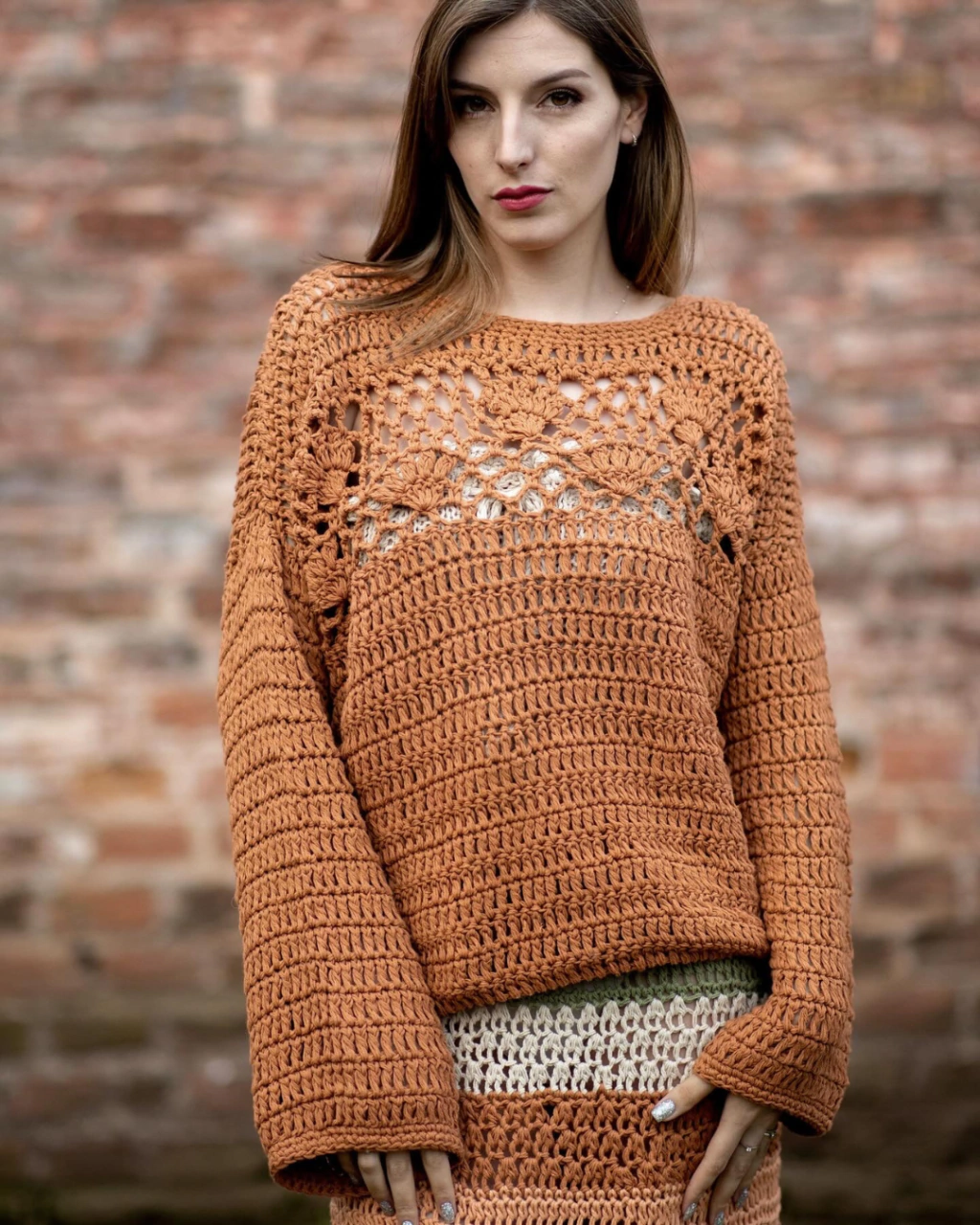 Sweater tejido a mano, a crochet, se destaca pir su diseño artesanal de calado de flores en el escote.